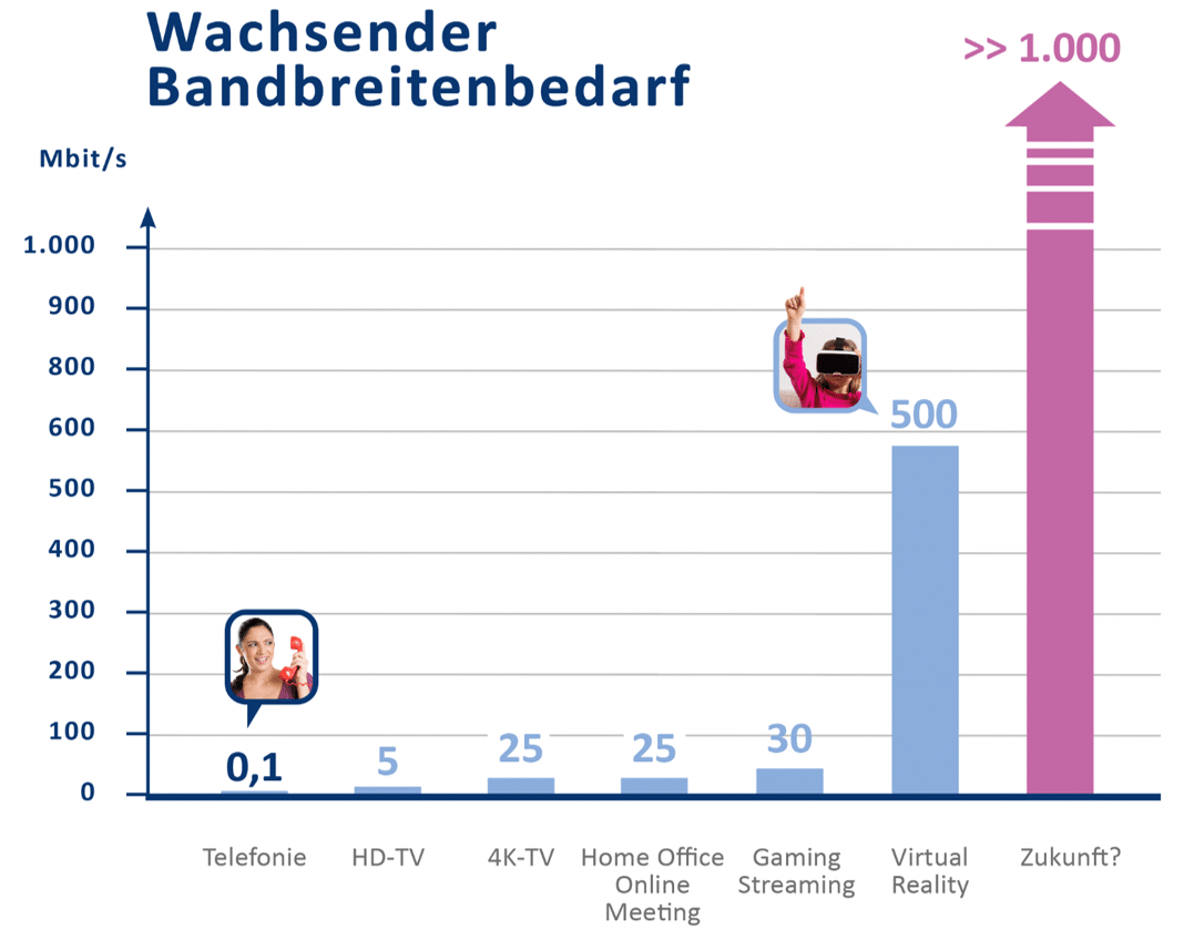 Nur Glasfaser bietet derzeit und in den nächsten Jahrzehnten das höchste Maß an Geschwindigkeit in der Übertragung und ist damit die Schlüsseltechnologie der Digitalisierung. Mit Glasfaser wird eine nahezu unbegrenzte Menge an Daten in Lichtgeschwindigkeit übertragen, wodurch alle Vorteile des Internets ausgenutzt werden können. Glasfaser ist aktuell in der Lage, eine Datenübertragungsrate von mehr als 100 Gbit/s zu liefern, technisch gesehen gibt es aber noch jede Menge Luft nach oben. Glasfaser ist somit heute und künftig das zuverlässigste und unkomplizierteste Mittel für hervorragendes Internet und wird die herkömmlichen Kupferleitungen in naher Zukunft ablösen. Somit ist man mit einem echten Glasfaseranschluss wie er von der nöGIG realisiert wird, auf jeden Fall auf der sicheren Seite.